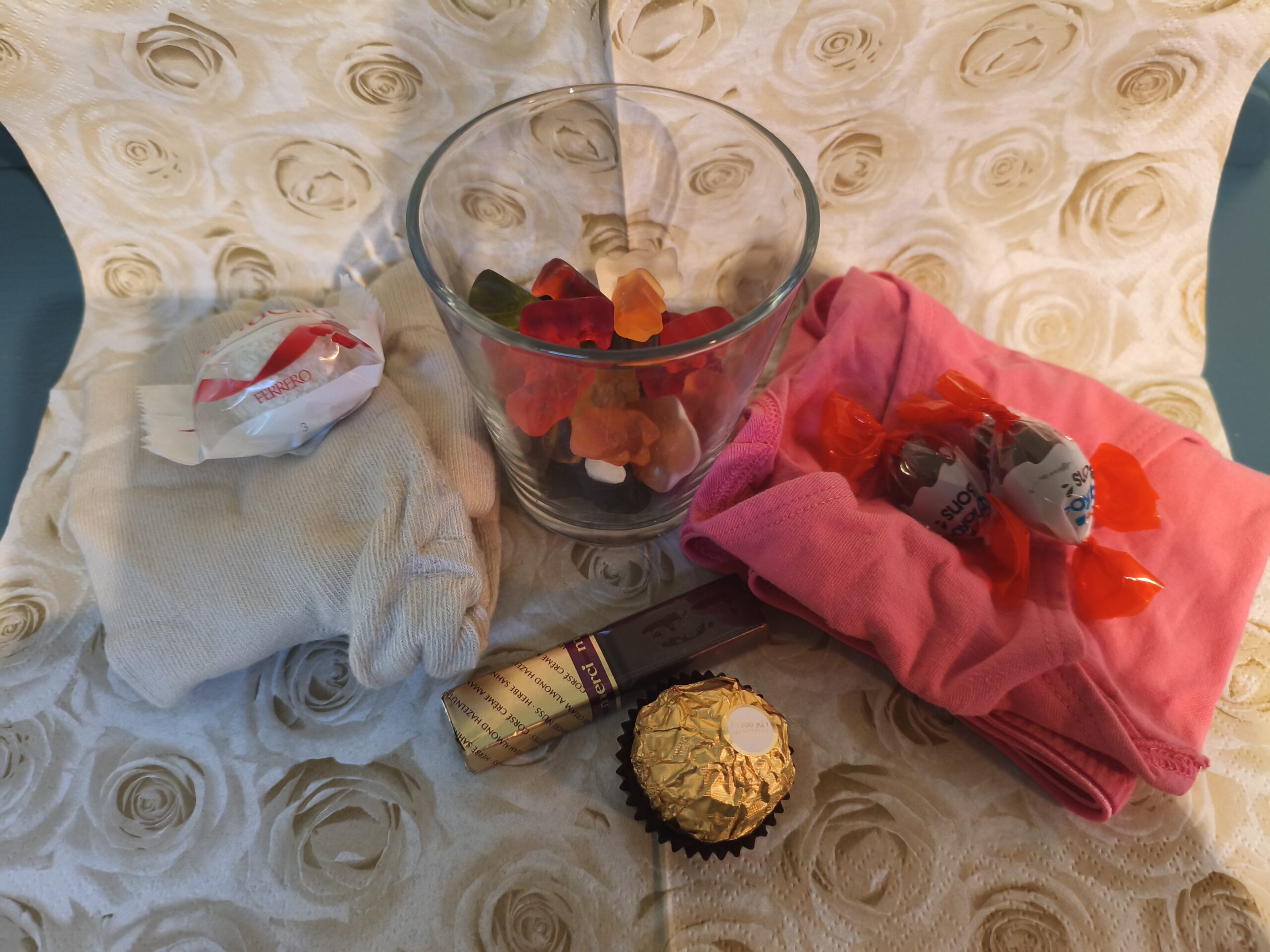 –Mein Kennenlern-Set beinhaltet : 1 Schokokugel, 1 Schokoriegel, 2 Schokobons, Gummibärchen-/ Weingummimix, 1 Kokoskugel, Alles mit KV veredelt und in der